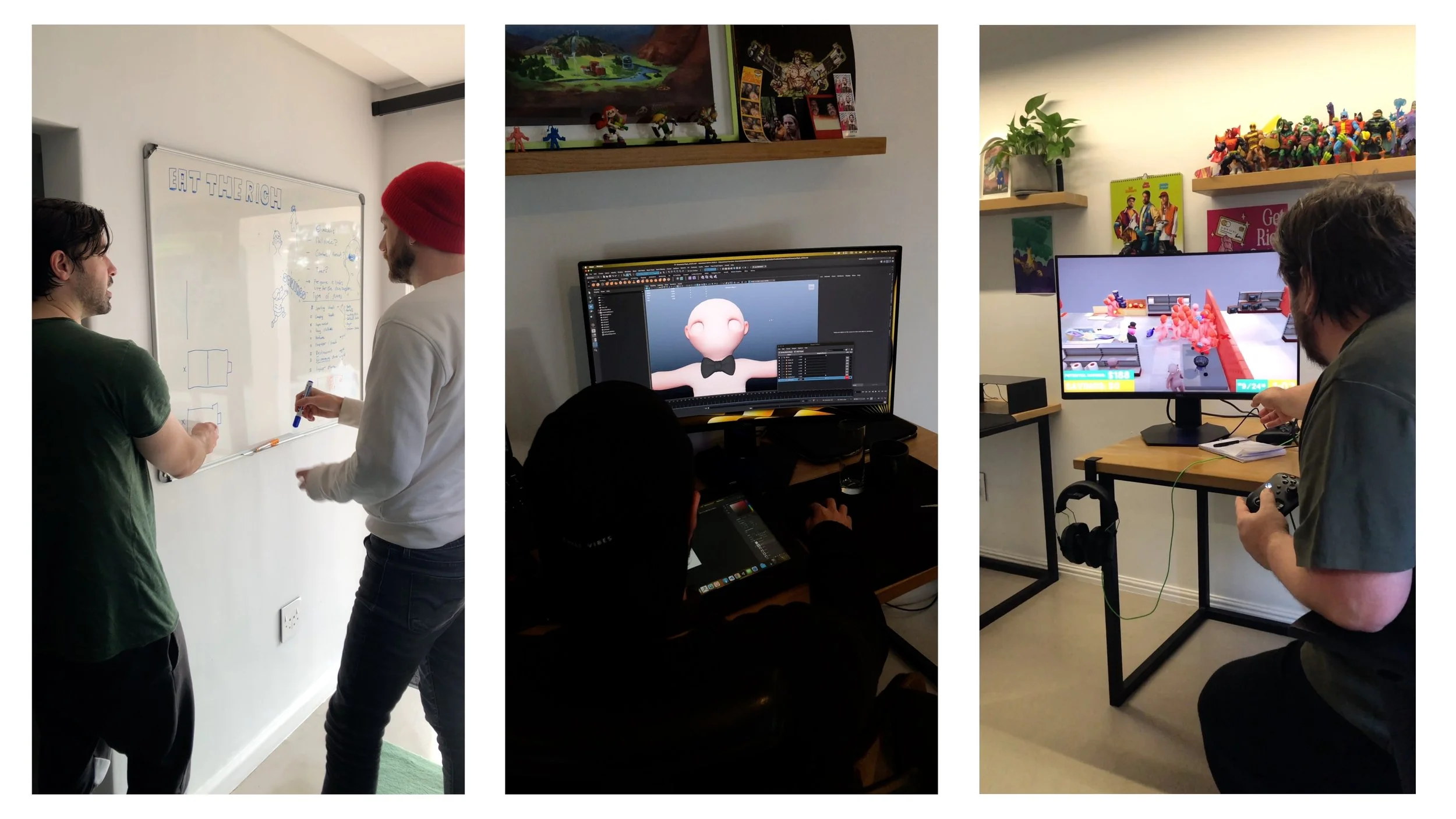 It became clear we needed some kind of mid-game progress cutscene. No prior knowledge or explanation. Your friendly neighborhood narrative designer figured he’d capture video in-engine and stage the existing game assets and animations to produce low-cost, hyper-fun cutscenes and original narrative content, helping build Eat The Rich’s “Bezoverse.” (Machinimacore).